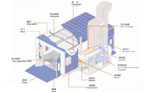 橫流式噴漆房:氣流從房的一端流向另一端。此種機型成本低,易安裝。缺點是霧狀物沿著車身側(cè)面移動,且霧氣不能從操作者的面部周圍除去,工作環(huán)境不盡人意。