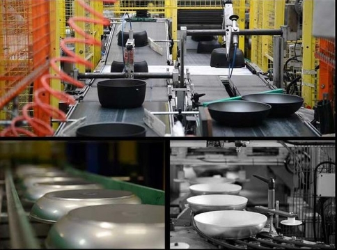 鐵氟龍噴涂生產(chǎn)線?主要針對廚具行業(yè)如不粘鍋,電飯鍋內(nèi)膽,刀具,烤盤等等。其主要工藝流程:噴砂前處理 → 吹塵 → 噴底油 → 固化 → 噴面漆 → 燒結 → 冷卻 → 下件。