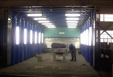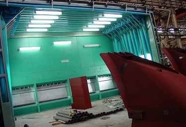 照明系統(tǒng)室內(nèi)設(shè)置上、下兩排照明裝置。頂側(cè)燈組呈45o角安裝,布置方式為:2支×40W×2側(cè);腰側(cè)燈組間隔安裝于墻板內(nèi),布置方式為:2支×40W×2行。所有燈箱均采用δ1.2鍍鋅板制作,并噴白漆美觀大方,又可防止銹跡象產(chǎn)生。燈管采用隔爆型飛利浦高效光源,既安全又節(jié)能且維護(hù)方便,鎮(zhèn)流器采用噴漆室專用電子鎮(zhèn)流器,從而保證每個(gè)噴漆室體光強(qiáng)≥800Lux,滿足工件各端面的噴涂作業(yè)。燈箱與壁板用小角鐵相連,同時(shí)燈箱上安有可拆框架,便于維護(hù)。 | ![]() |