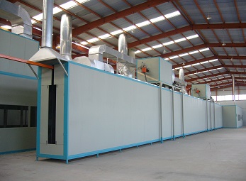 在工作時(shí),通過(guò)新風(fēng)機(jī)組內(nèi)的換熱裝置對(duì)循環(huán)風(fēng)進(jìn)行加熱。烘干設(shè)計(jì)溫度0~80±5℃,加熱能源天燃?xì)?,熱風(fēng)從頂部送入,下部回風(fēng)。以保證烘干室各段風(fēng)量、溫度均勻。工件烘干過(guò)程中,工件漆膜內(nèi)殘存的有機(jī)溶劑不斷揮發(fā)出來(lái),為了使烘干室內(nèi)的氣體中有機(jī)溶劑的含量低于爆炸濃度的下限,烘干室保持安全運(yùn)行,循環(huán)熱風(fēng)中要補(bǔ)充一定的新鮮空氣,同時(shí)要排出一定量的高濃度的廢氣。烘干室內(nèi)裝有溫度傳感器,以顯示各點(diǎn)溫度,并設(shè)有自動(dòng)調(diào)溫裝置,使溫度波動(dòng)控制在±5℃以內(nèi)。 | 天然氣加熱烤漆烘干房在工作時(shí),新風(fēng)空氣通過(guò)燃燒器加熱后,在循環(huán)風(fēng)機(jī)作用下經(jīng)過(guò)過(guò)濾器,進(jìn)入烘干室底部的送風(fēng)管道,熱風(fēng)從出風(fēng)口出排出進(jìn)入烘干室內(nèi),對(duì)工件表面漆膜進(jìn)行烘干,利用熱空氣上升原理,在頂部設(shè)置回風(fēng)管路再進(jìn)入循環(huán)風(fēng)機(jī)組,使熱風(fēng)能循環(huán)使用。 |