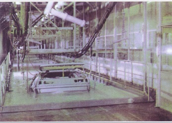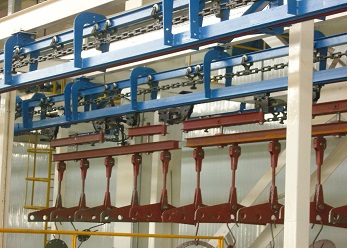 電泳涂裝線前處理大多采用浸漬式與噴射式處理方式(也可采用噴射與浸漬結(jié)合方式),其主要目的是通過化學(xué)液體(硫酸、硝酸)以浸泡或噴射的方式,與工件表面的氧化物、油脂等產(chǎn)生化學(xué)反映來達(dá)到除油、脫脂、除銹、水洗、純水洗的目的。電泳采用陰極電泳或陽極電泳,陰極電泳與陽極電泳比較,陰極電泳在技術(shù)上更成熟,其泳后漆膜附著力及防腐蝕力比陽極電泳更強(qiáng)。泳后裝飾涂料可采用噴朔或裝飾性油漆。自動輸送系統(tǒng)前處理一般采用自行葫蘆或積放式輸送設(shè)備,前處理后轉(zhuǎn)線一般采用地鏈滑撬、懸掛輸送鏈、總行葫蘆等輸送方式。具體需要根據(jù)工件情況決定。其主要決定因素:工件大小、形狀、重量、材質(zhì)等。